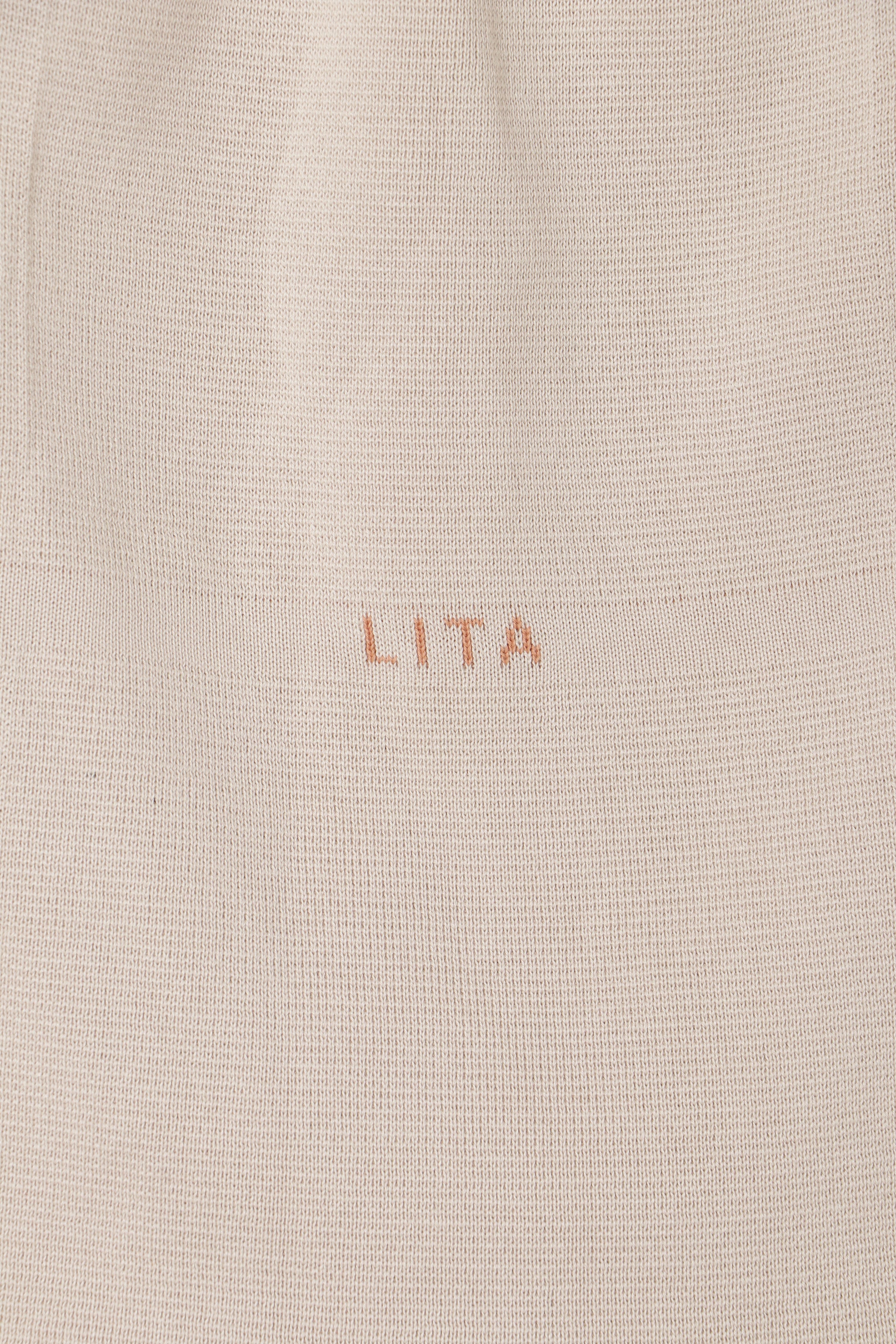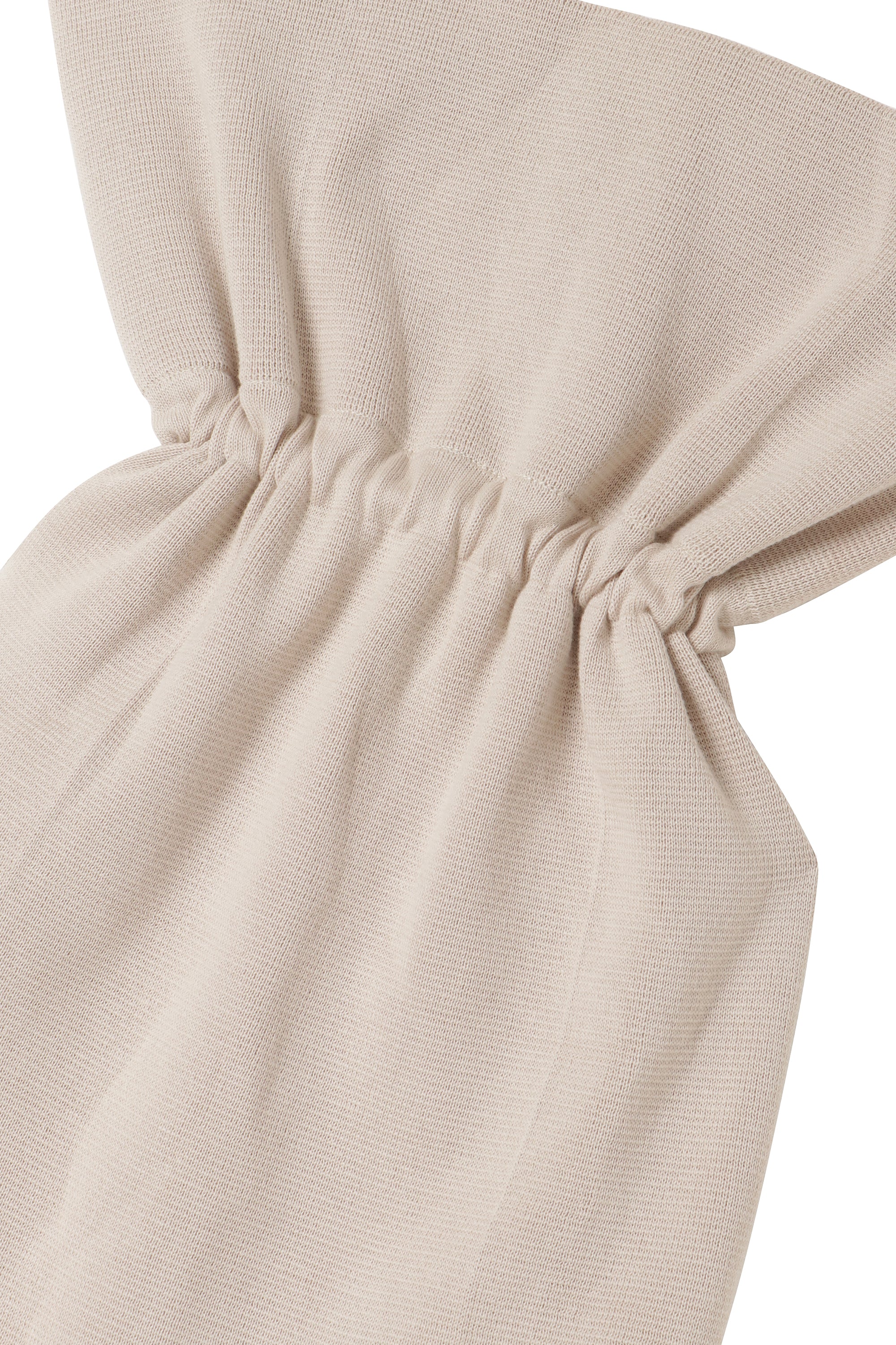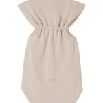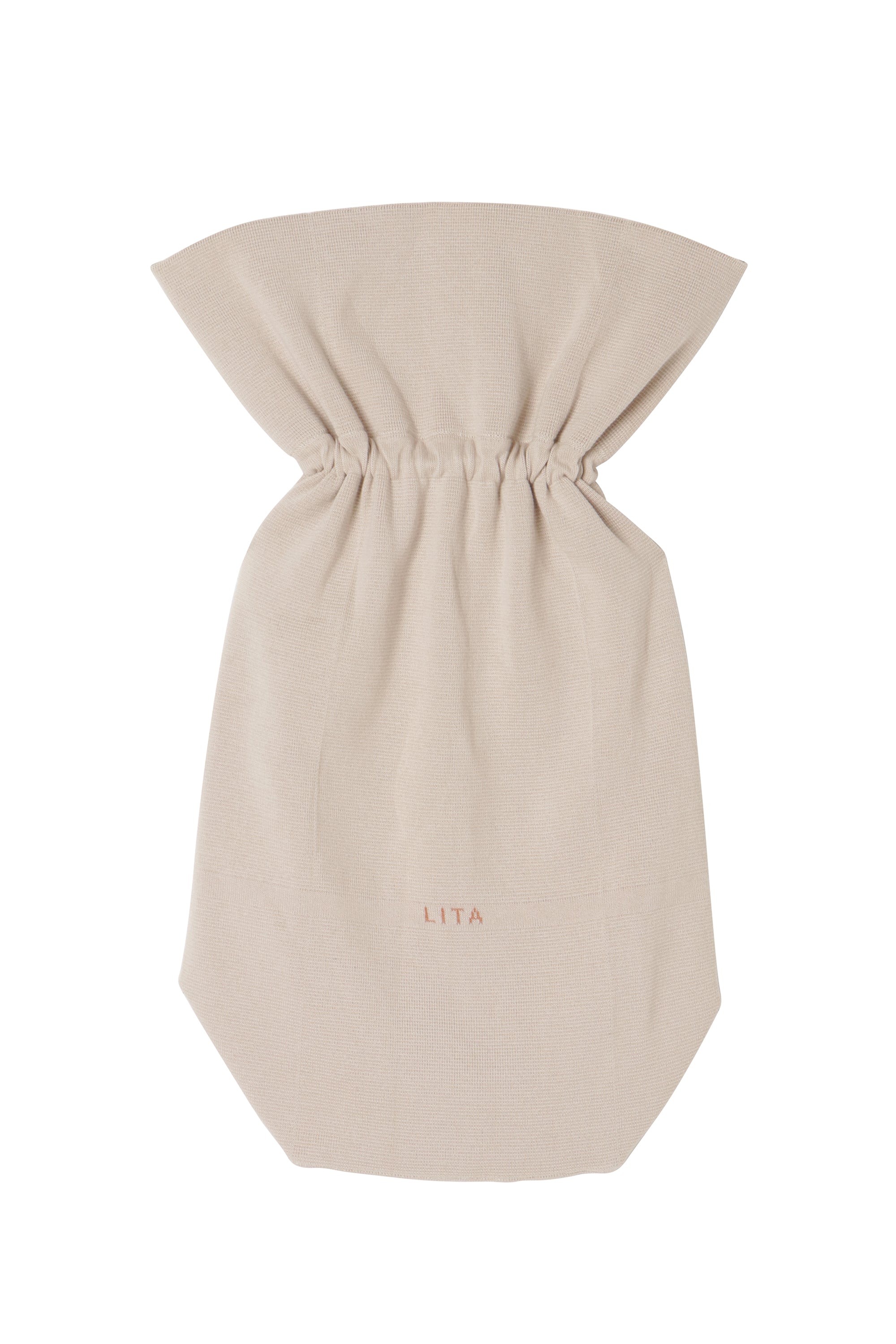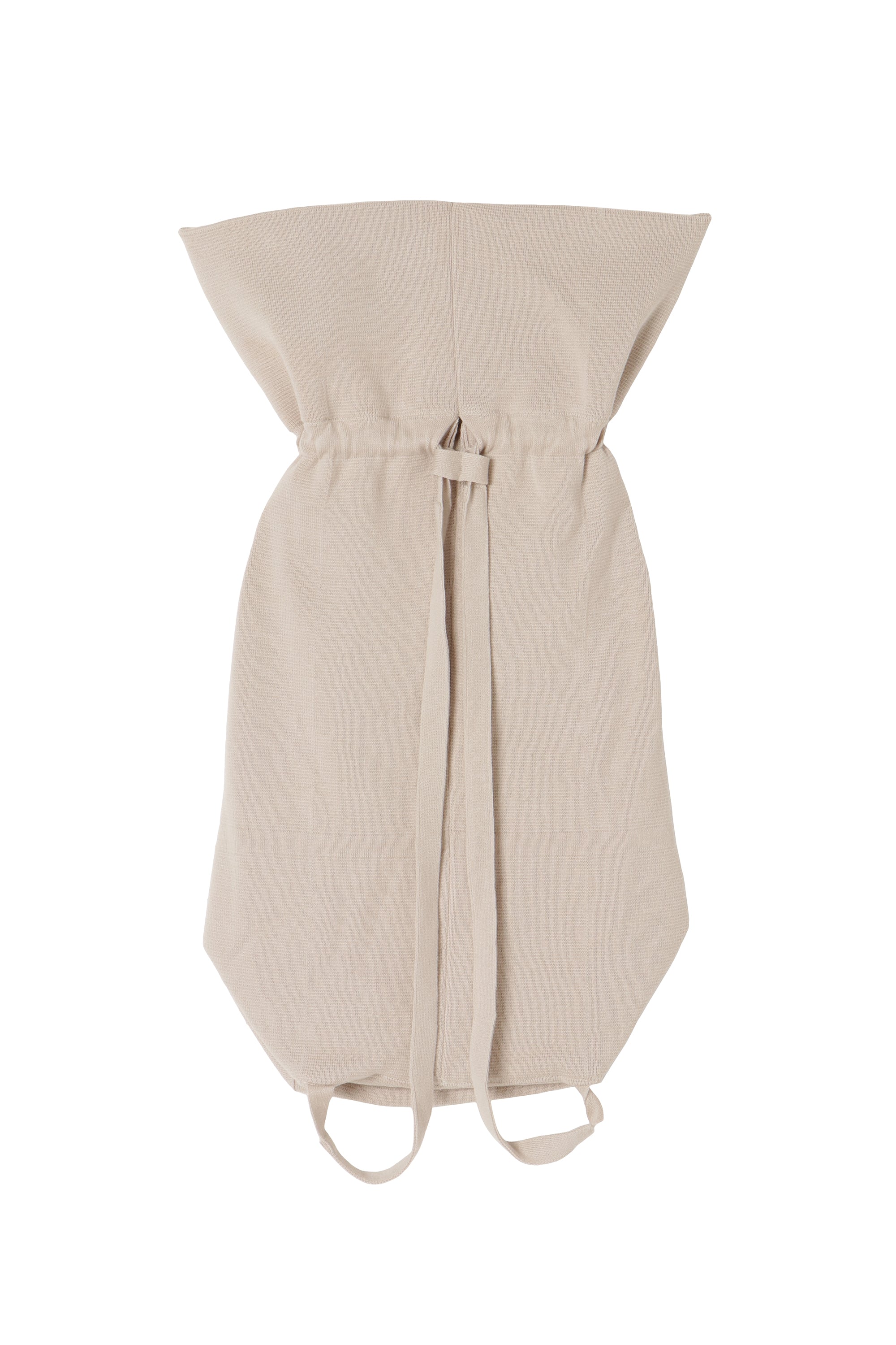 This bag is made entirely of cotton without metal fittings and uses as few stitches as possible, forming its shape through knitting, making it unique to knitted bags. It can be worn on the shoulder or as a backpack. The brand logo is knitted into the knit.