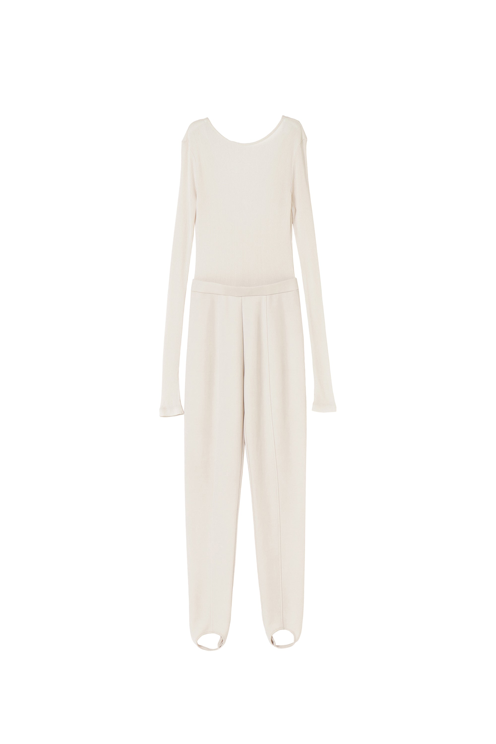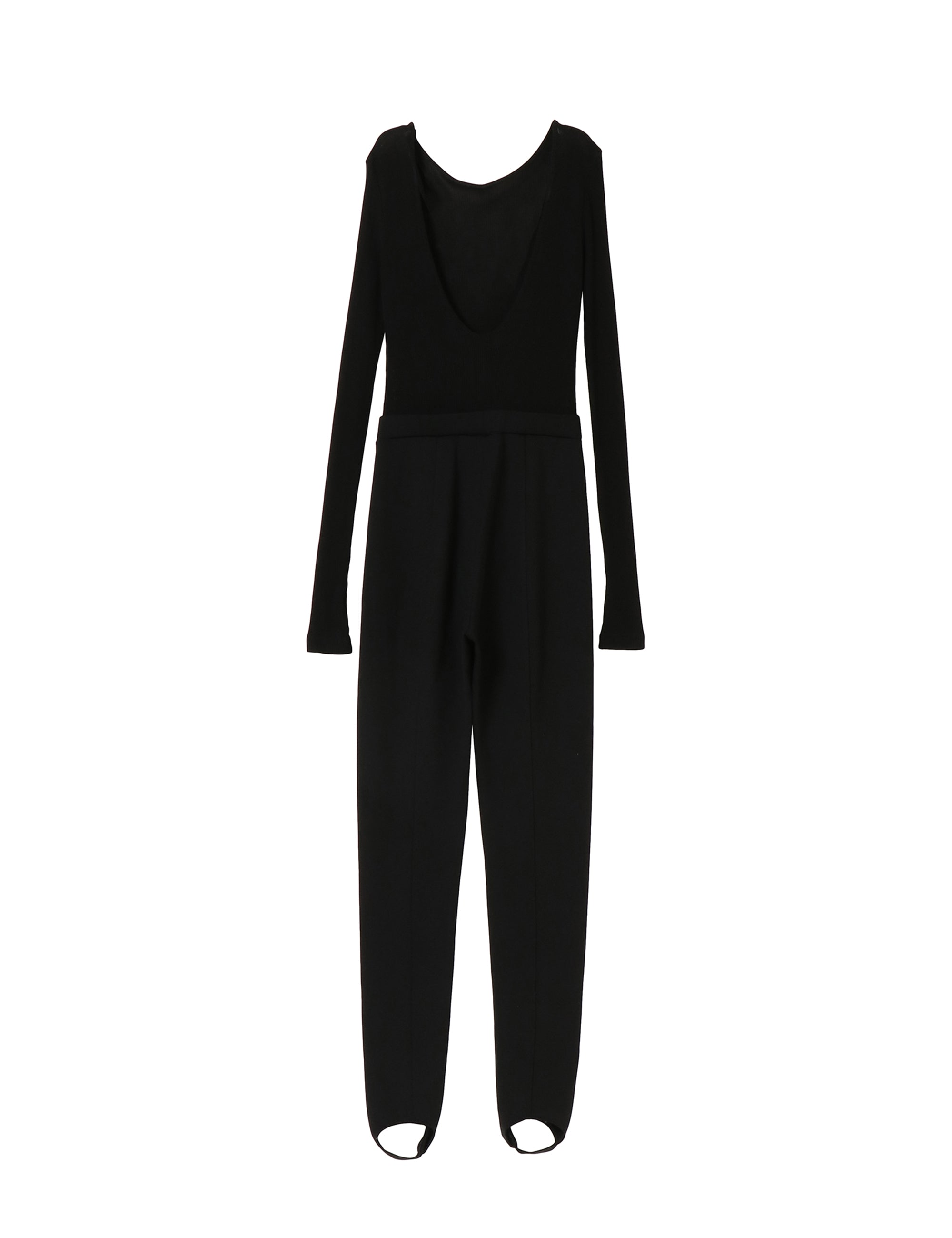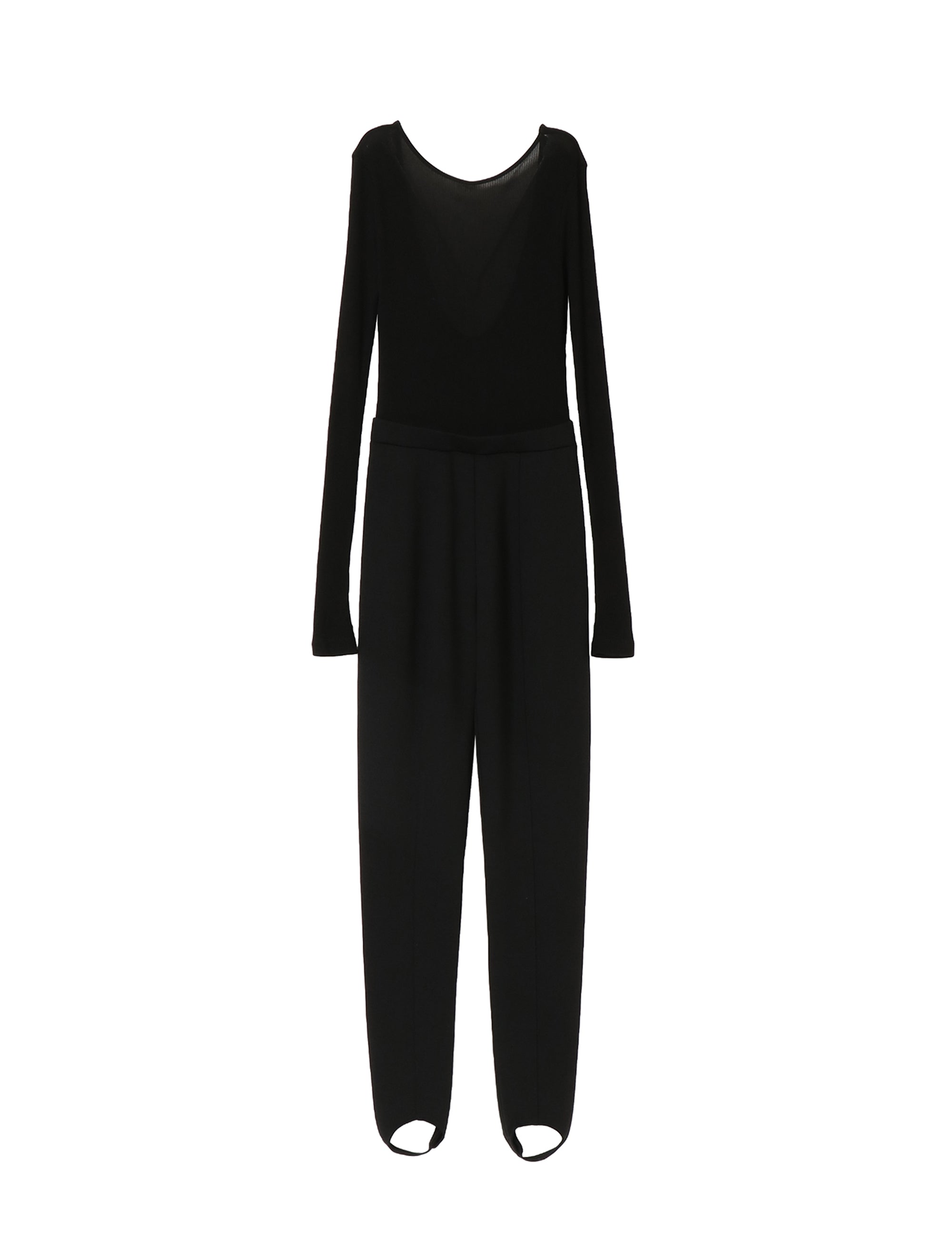 This all-in-one type combines a tight full-sleeve shirt with slim slacks. The bottoms are designed with the slim slacks in mind, allowing for movement, and feature a design line at the center crease for an elegant look. This is a top-selling item from LITA, allowing you to enjoy a complete yoga style with just one piece.