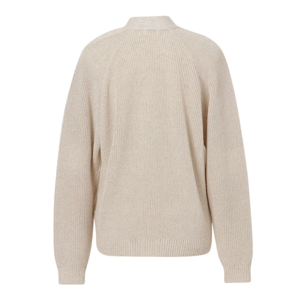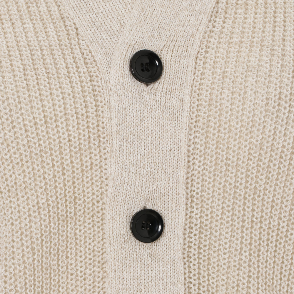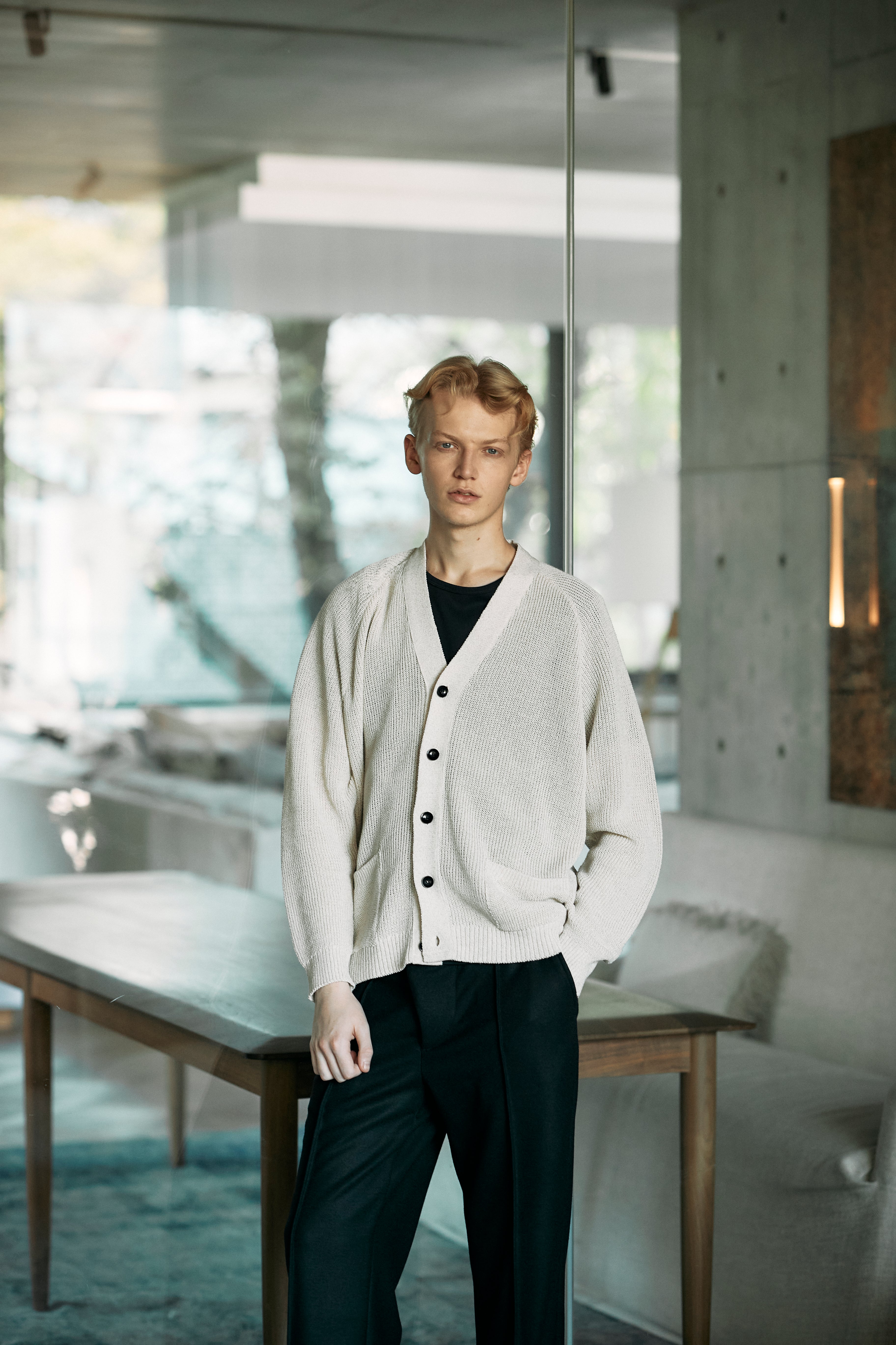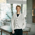 This mid-gauge garment is easy to wear as a jacket or as an inner layer in autumn and winter, and its soft texture and natural color make it a gender-neutral item.
