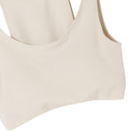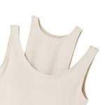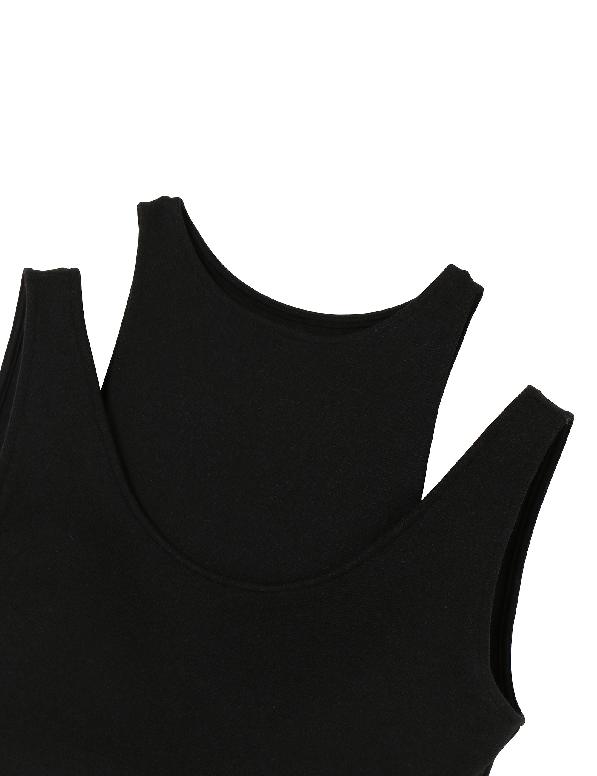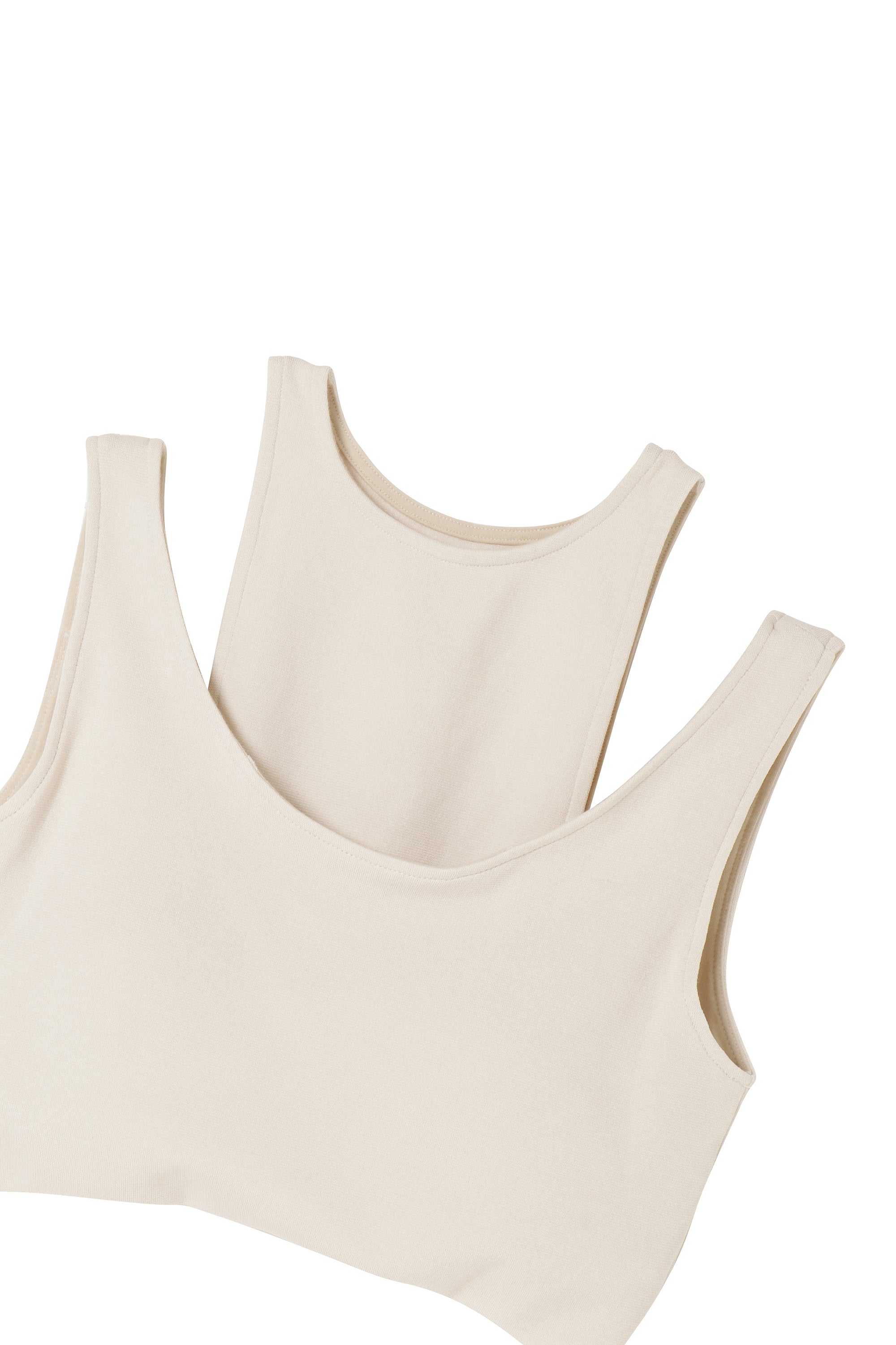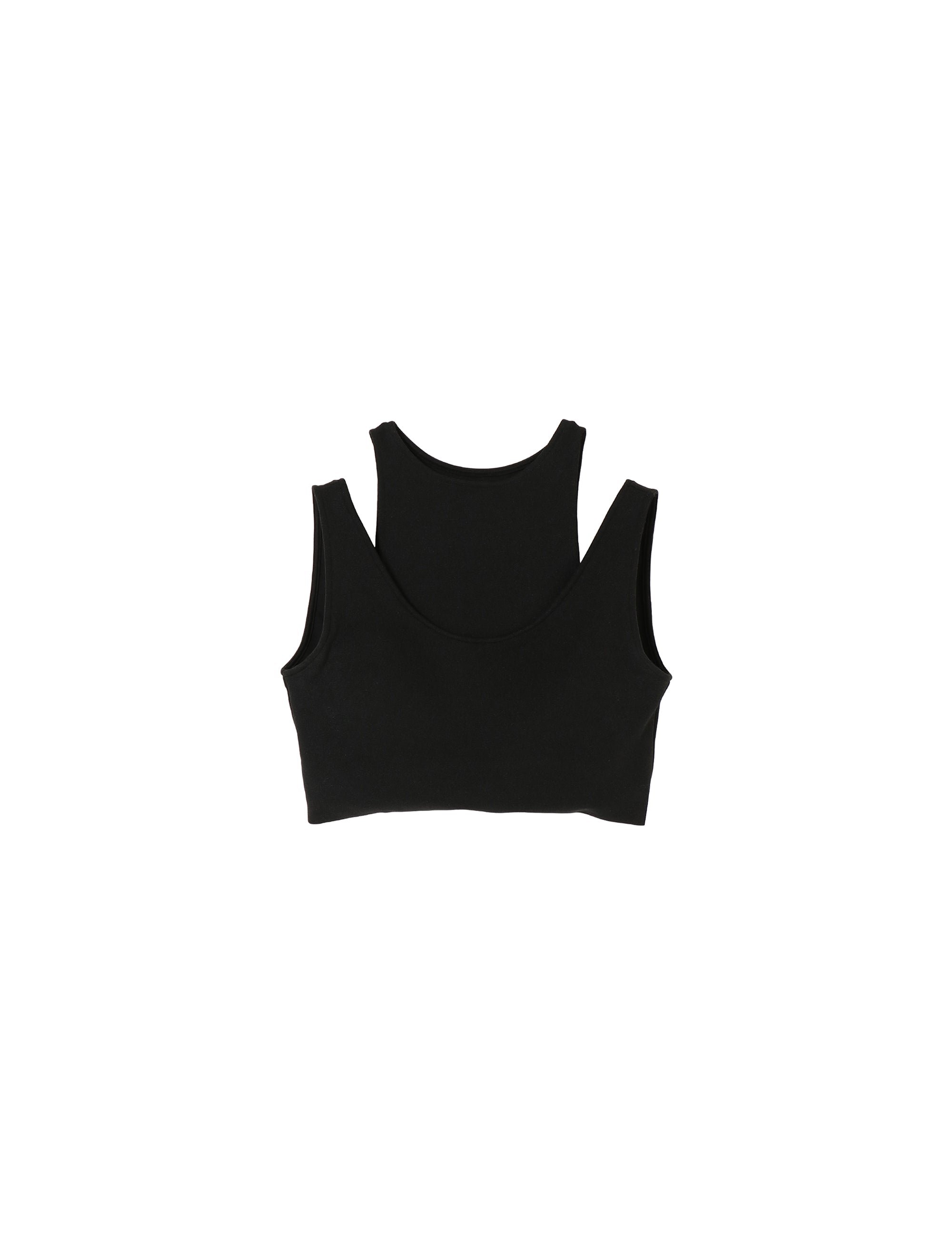 The inner layer has a shallow drop in the front and the shoulders are as narrow as possible, while the outer layer has a large neckline to give it a lighter feel and movement; this mid-length bra top has a distinctive layered look that gives off a chic and casual vibe without showing off too much of the chest area, which is typical of Japanese style.