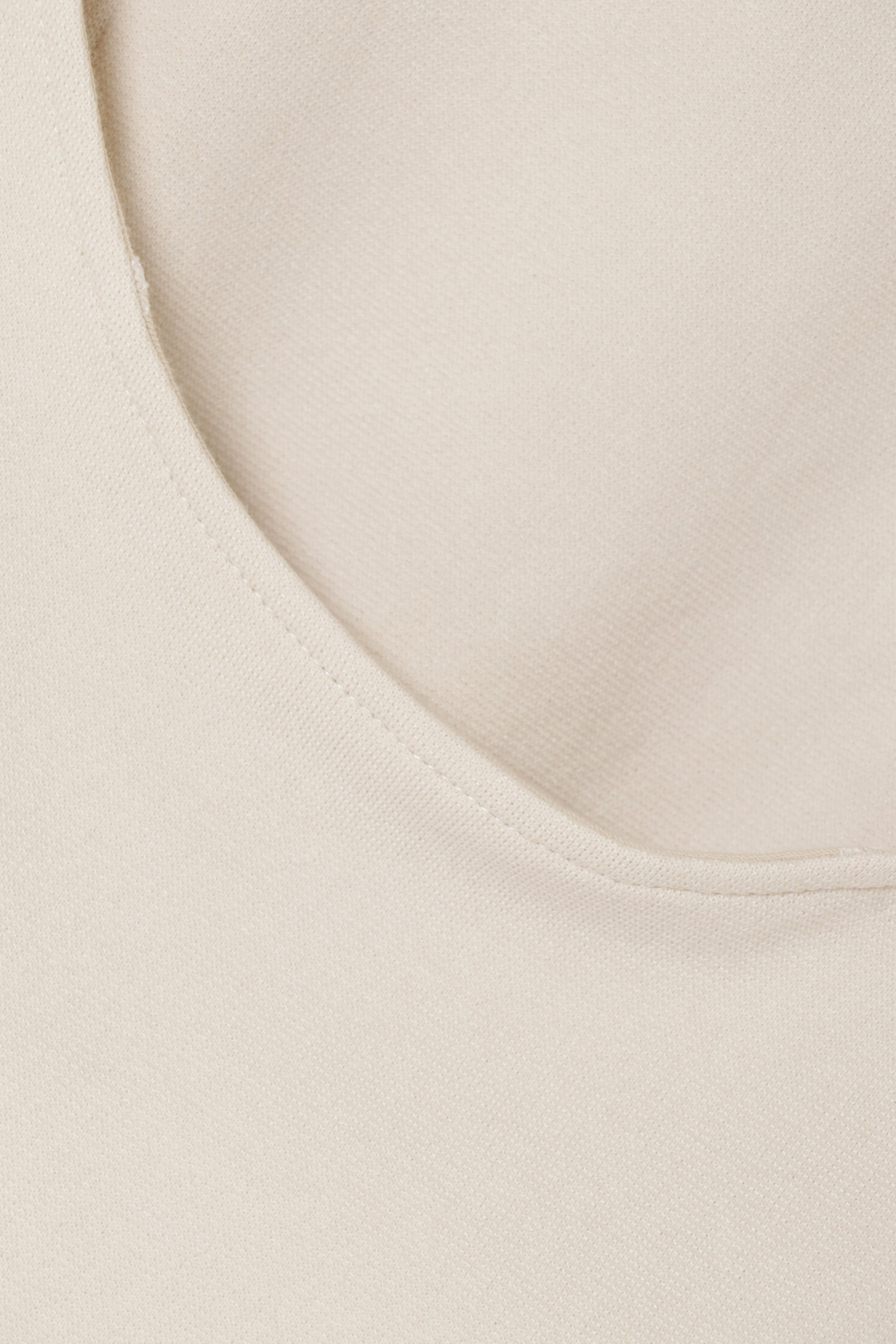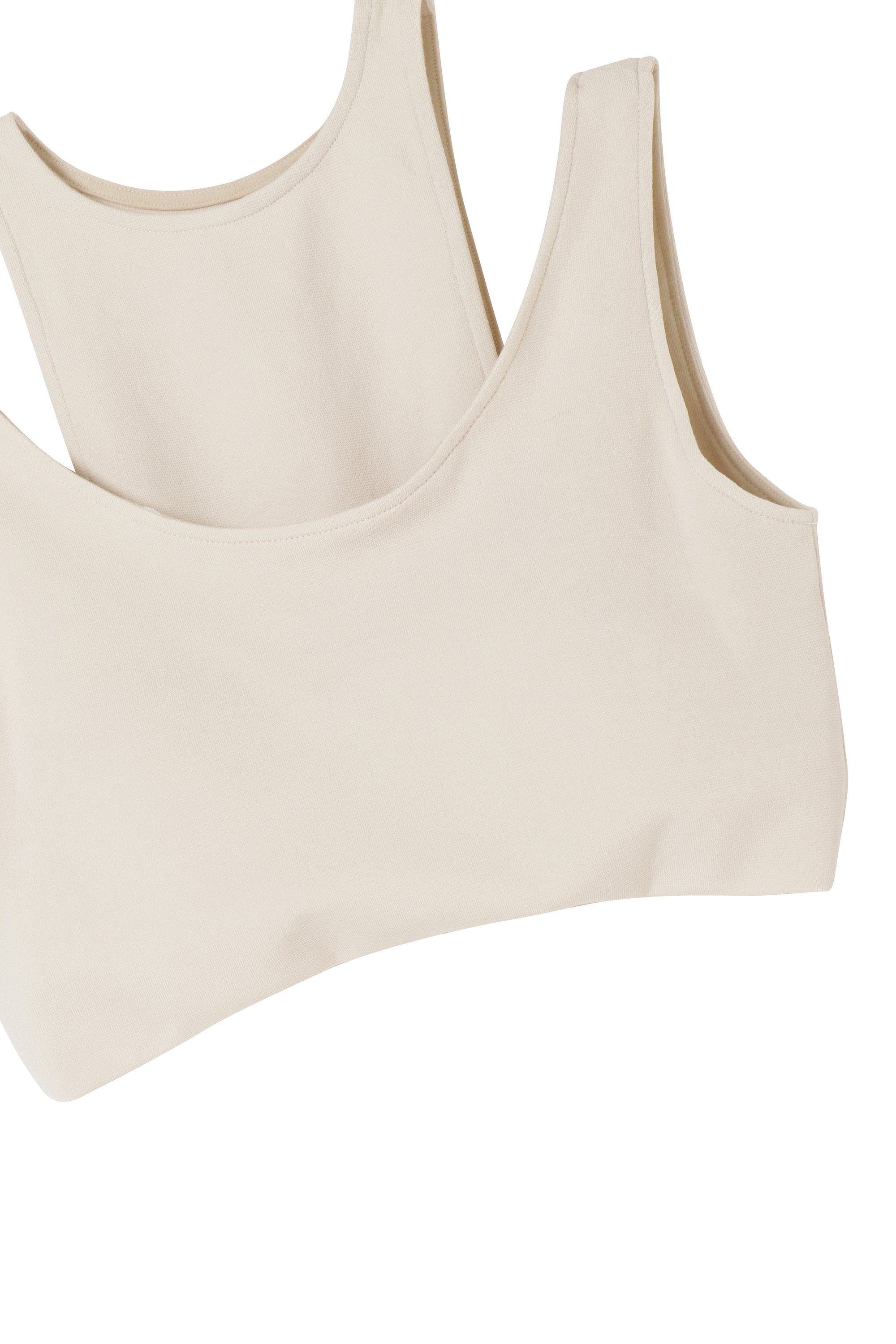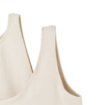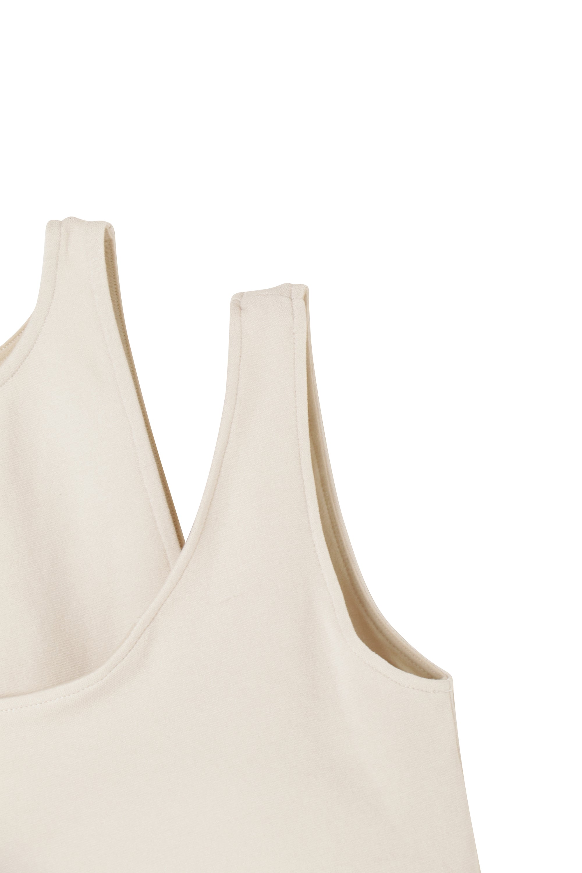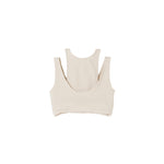 The inner layer has a shallow drop in the front and the shoulders are as narrow as possible, while the outer layer has a large neckline to give it a lighter feel and movement; this mid-length bra top has a distinctive layered look that gives off a chic and casual vibe without showing off too much of the chest area, which is typical of Japanese style.