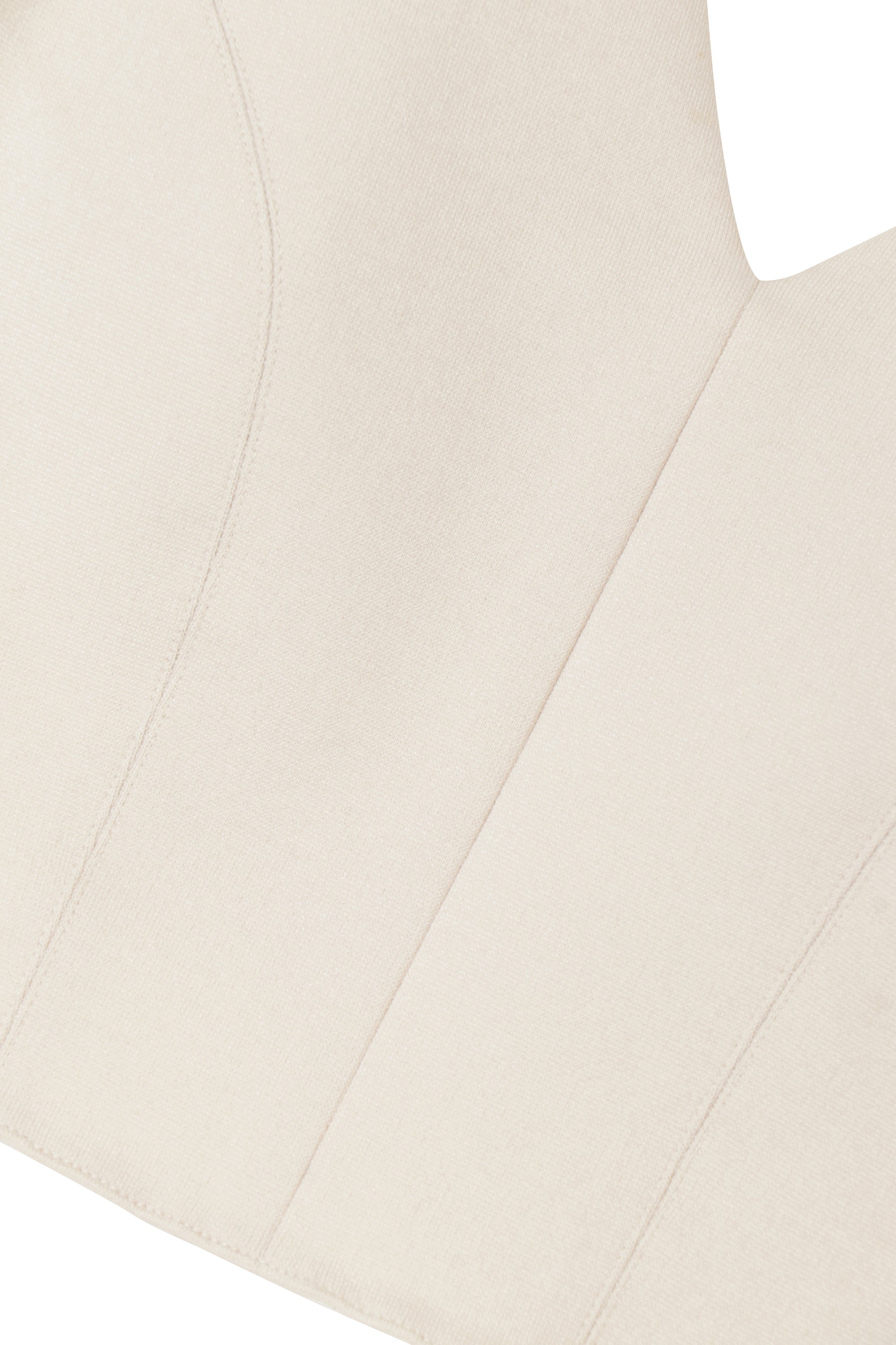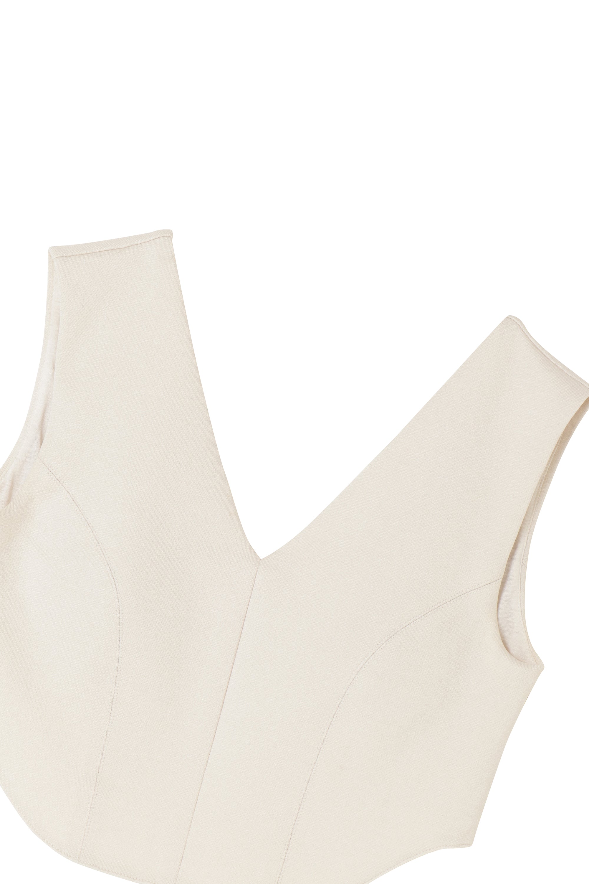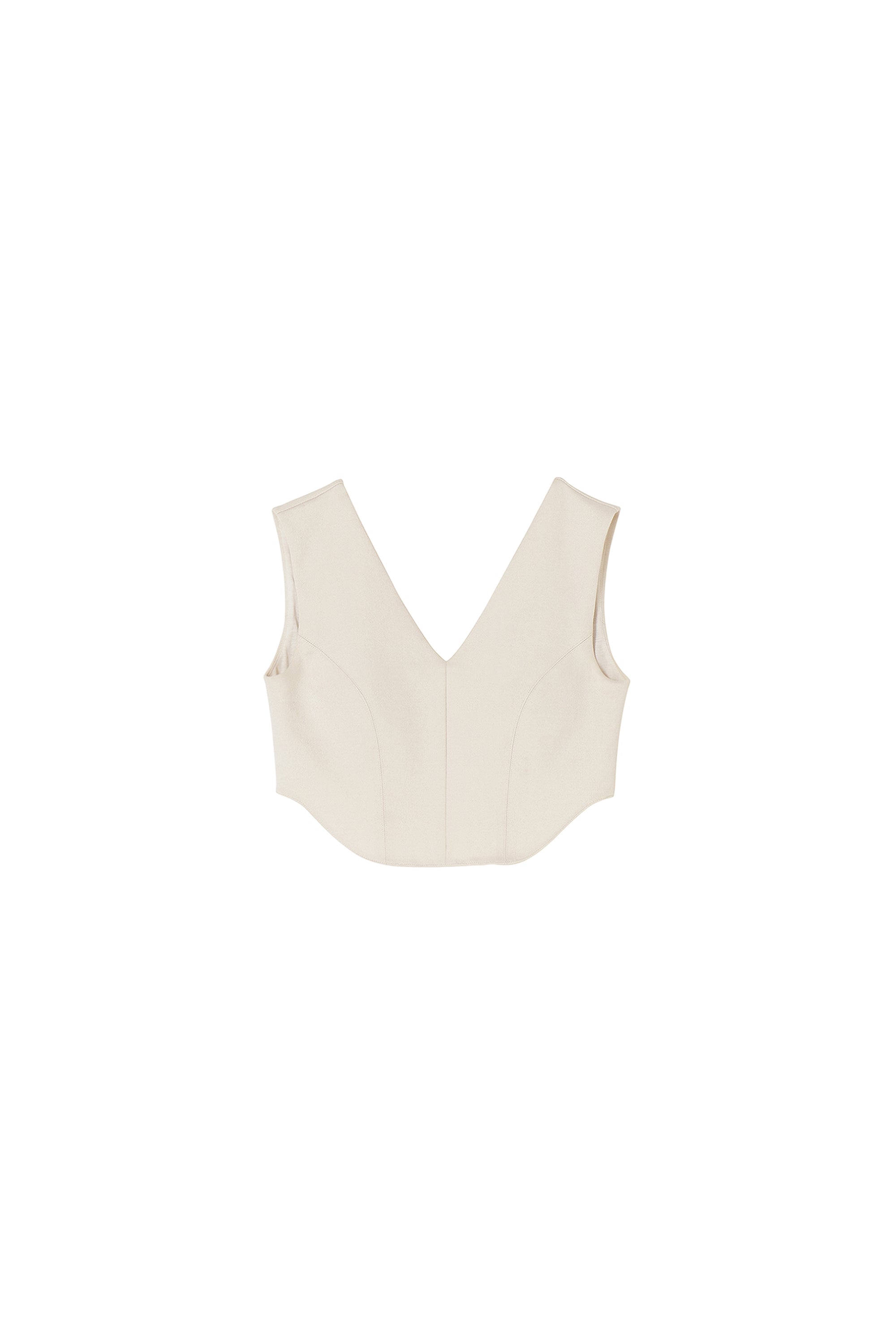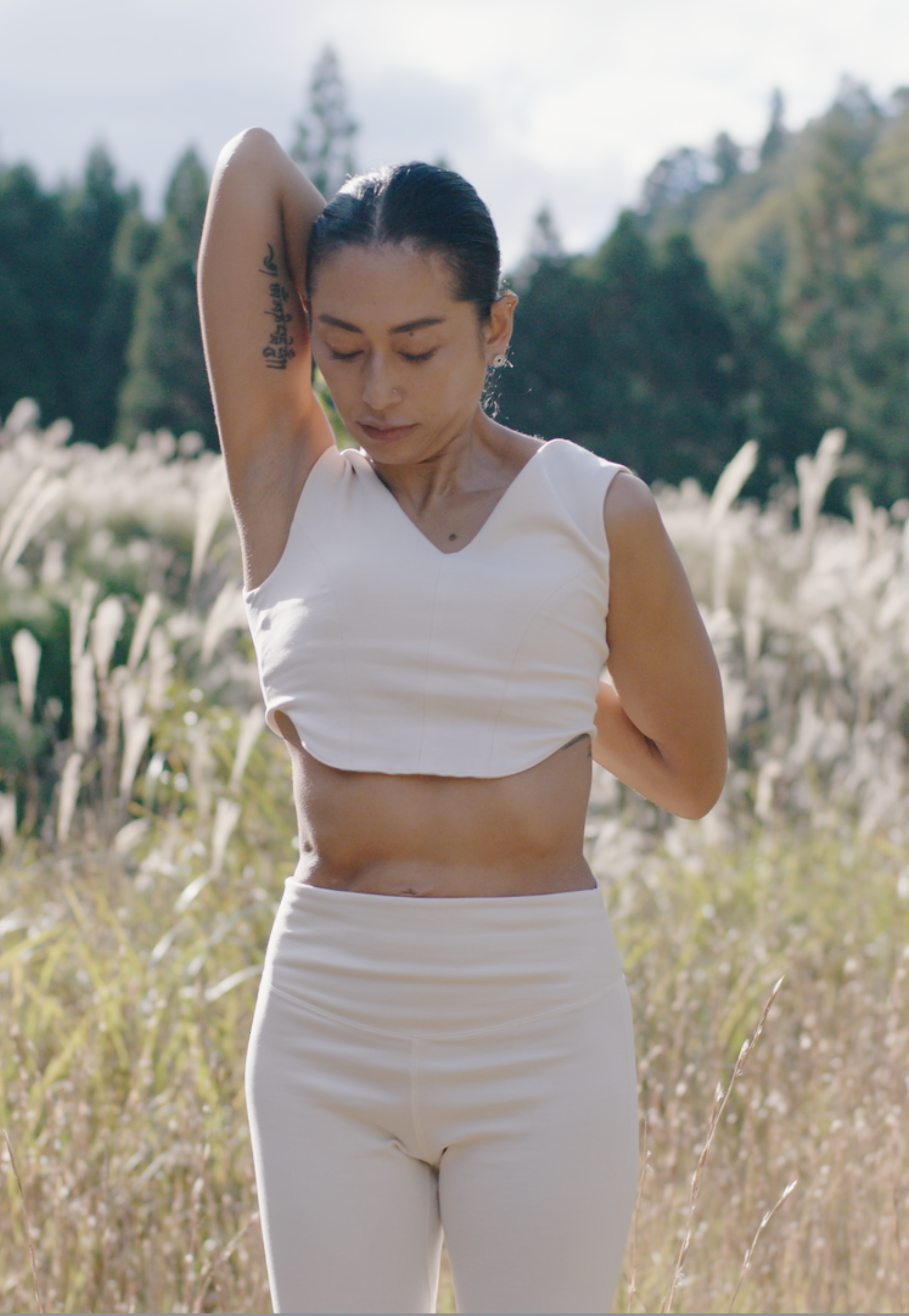 This simple and unique long-length bra top has darts on the princess line and is designed to avoid the hemline and pelvis, creating a sleeker impression.