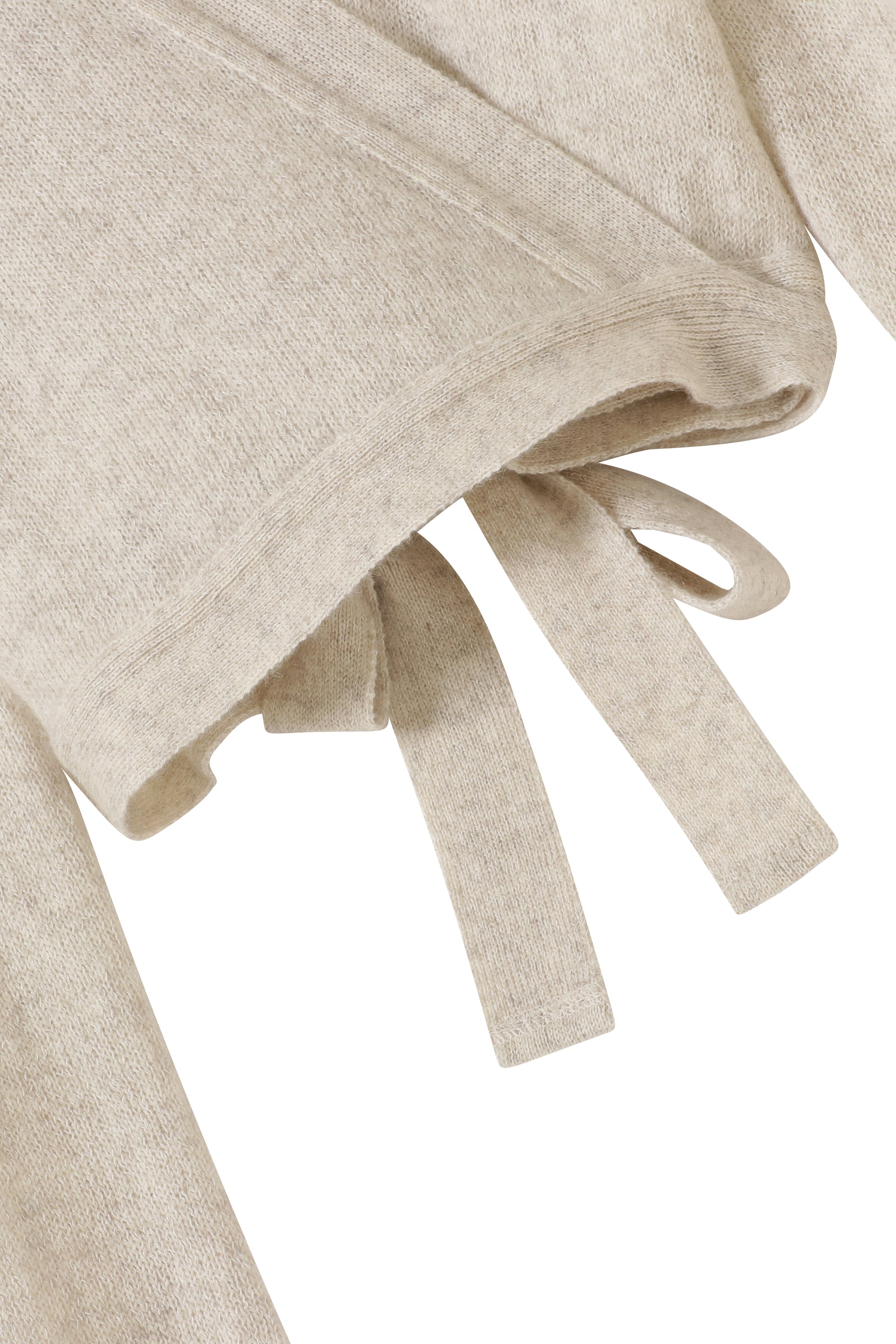 ウエストのタイで留めるラップスタイルに仕上げています。