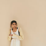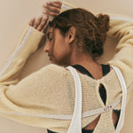 空気を含んだ様な程良い透け感があり、とても軽く柔らかく包まれる様な肌触りが特徴の素材になります。後は綿のブランドロゴ入りテープがアクセントになっています。